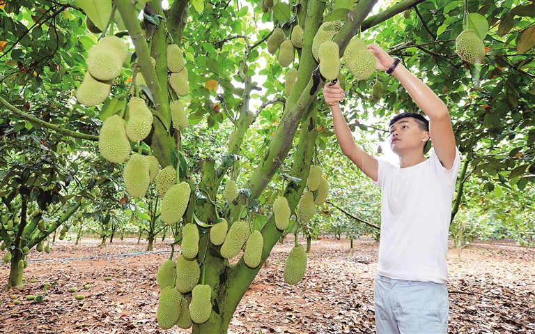 6月24日,琼海市塔洋镇的榴莲蜜种植基地里,华中农业大学毕业的王春正在管理满园的榴莲蜜。2008年大学毕业后他选择了回乡创业。2010年他和家人商量选择了新兴水果——榴莲蜜进行种植,取得了良好收益。今年,果园已经连续4年挂果,200多亩丰收的榴莲蜜预计产量14万斤,产值达280多万元。据悉,榴莲蜜原产于马来西亚,一个成熟的榴莲蜜,里面的果苞有20个左右,甜度适中,果肉柔软,香味浓郁,口感好,市场前景广阔。本报记者 王凯 摄