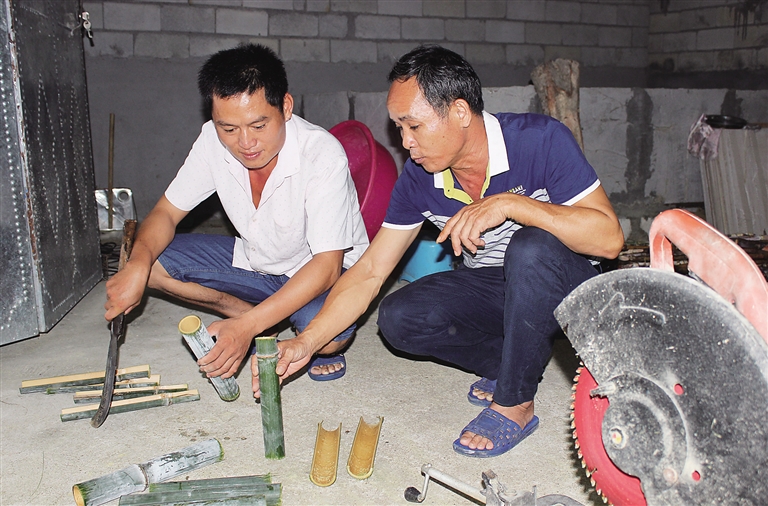 一根竹子被电锯截成五六段,用柴刀劈成竹片后放进栏舍。一群翘着长胡子的黑色竹狸凑近竹片张开嘴巴,传来一阵清脆的“嘣嚓嘣嚓”声,小精灵们津津有味地吃起了美餐。这是今天儋州市和庆镇文卷村贫困户冯正明喂养竹狸的场景。