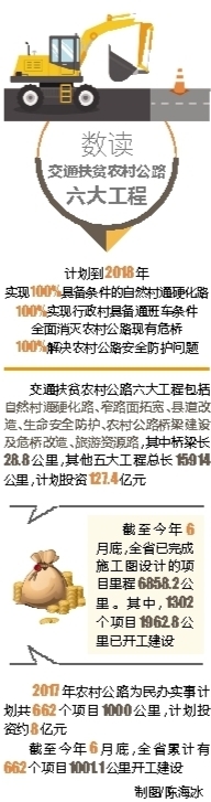 去年下半年,根据省委、省政府的工作部署,按照“省级主导、市县主体、部门保障、社会支持”的原则,我省启动了总投资超127亿元的交通扶贫农村公路六大工程建设,计划到2018年,实现100%具备条件的自然村通硬化路,100%实现行政村具备通班车条件,全面消灭农村公路现有危桥,100%解决农村公路安全防护问题。