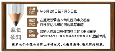 6月28日,各幼儿园将会结合自己幼儿园的学位情况制定方案并在幼儿园网站和幼儿园显著位置向社会公布。家长可在百度等搜索引擎输入幼儿园的中文名称,自行在幼儿园的网站填写申请。
