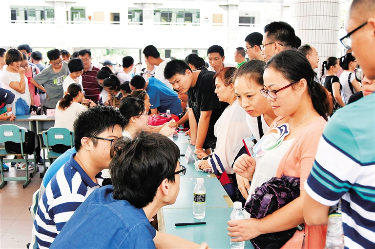 6月28日,海南中学举行“中招开放日”活动,吸引全省近千名2017届初中毕业生及其家长前来参加。当天,海中名师、高年级学长向前来咨询的学生和家长介绍海南中学的中考招生政策,提供估分服务和填报中考志愿指导,为优秀考生圆“海中之梦”答疑解惑。
