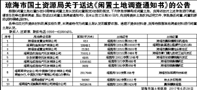琼海市国土资源局关于送达《闲置土地调查通知书》的公告