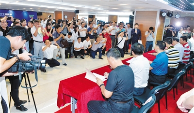 | 6月28日,海南萨拉坦体育与易建联薪火阵营签约仪式在海口文化产业园举行,多位体育名将出席活动。 本报记者 王凯 摄 |
