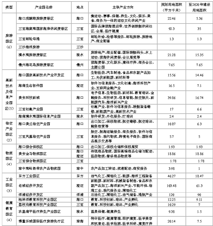全省生产型产业主要布局在国家重点开发区域,具体落在省级重点产业园区。省级重点产业园区是海南未来主导产业发展的重要空间载体,按照“宜细不宜粗,宜精不宜多,宜实不宜泛”的原则,根据产业发展规划、资源和区位条件、结合建设现状,全省确定了六类24个省级重点产业园区,功能明确,布局合理。具体包括旅游园区(6个),高新技术及信息产业园区(5个),临空产业园区(2个),工业园区(3个),保税、物流园区(4个),健康教育园区(4个)。
