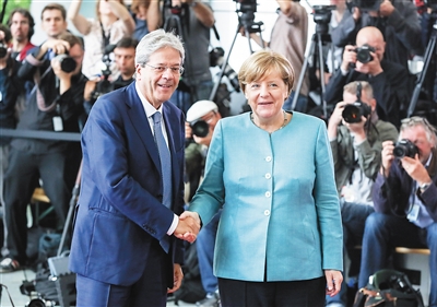 6月29日,在德国首都柏林,德国总理默克尔(前右)与意大利总理真蒂洛尼(前左)合影。 当日,德国、英国、法国、意大利、西班牙、荷兰、挪威等国领导人及欧盟领导人齐聚德国柏林,为即将在德国汉堡举行的二十国集团领导人峰会(G20)做准备。 新华社记者 单宇琦 摄