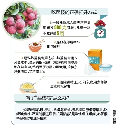生活中,如果人们连续大量地空腹食用鲜荔枝,则可能出现头晕、心慌、脸色苍白、饥饿感、出冷汗、恶心、手足无力等低血糖症状,严重者还会出现眩晕、抽搐、呼吸不规则、突然昏迷、脉搏细弱等症状,医学上称之为荔枝急性中毒,俗称“荔枝病”。