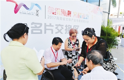 图1:6月28日,在2017海南省文体产业专题招商会上,与会嘉宾通过互扫微信、名片交换,做进一步交流。