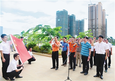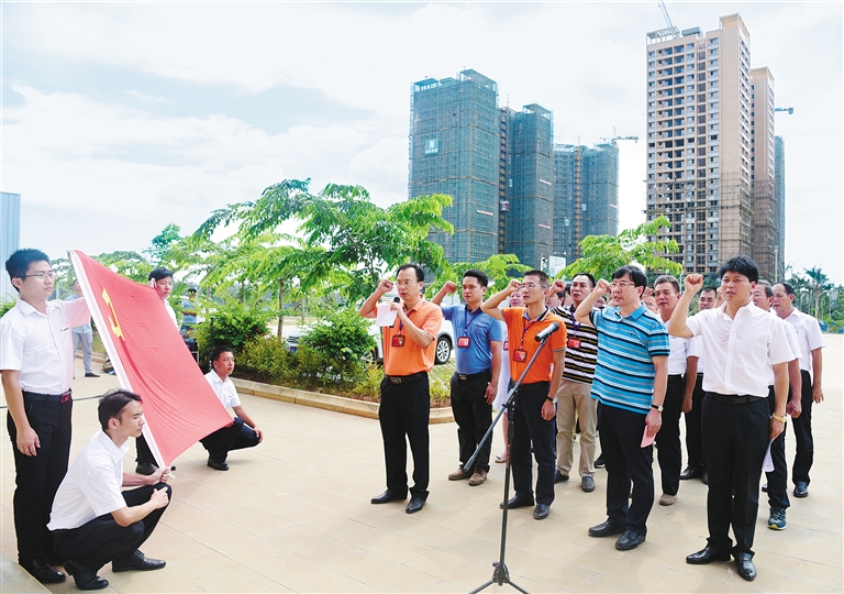 6月28日,海南(澄迈)金畅物流中心有限公司党支部举行揭牌仪式后,全体党员面对鲜红的党旗庄严宣誓。据悉,这也是金马物流中心第一个成立党支部的企业。