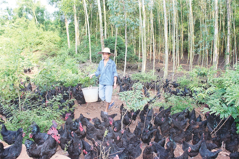 “儋凤”牌乌骨鸡寓意是儋州飞出的凤凰。张珊梅介绍,“儋凤”牌乌骨鸡并不是普通的鸡,其拥有三分之一飞禽的血统,有些乌骨鸡甚至可以像鸟儿一样轻盈地飞跃上几米高的树干上。张珊梅说:“这就是黑羽乌骨鸡,它野性十足,就因为这样,它们在树林中散养,吃这里的虫子,在树林中生活,生出来的鸡蛋因呈绿色而被称为‘绿壳鸡蛋’,因营养价值高被誉为‘蛋中之宝’。”