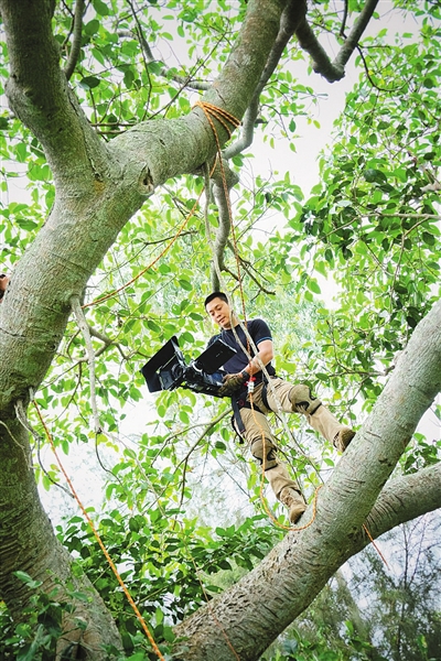 “整个剧组只有这么一台机子拍摄,可一个场景常需要三四个机位的效果。” 钱堃举起手中的摄像机说,为了保证画面的丰富度,同样的场景不得不让演员们在烈日下多演几遍,好让他从不同的角度拍。“一个场景连拍七八遍,是很正常的事。演员们要一次次克服枯燥感,展现最好的表演状态,是一件很辛苦的事。”由于剧组资金有限,没有钱租借摇臂,为了完成一场高空拍摄的场景,钱堃只得扛着摄像机,绑着绳索爬上四五米高的大树,站在树干上进行拍摄,让所有人都捏了一把汗。
