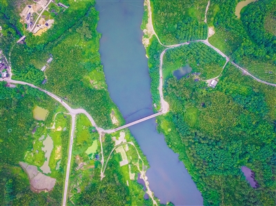 6月18日,俯瞰万泉河流经的东太农场,河上是连接东太农场片区和琼海会山镇的铁桥。位于东太农场境内的万泉河水流平缓,景色秀美,两岸椰果飘香。 本报记者 袁琛 摄