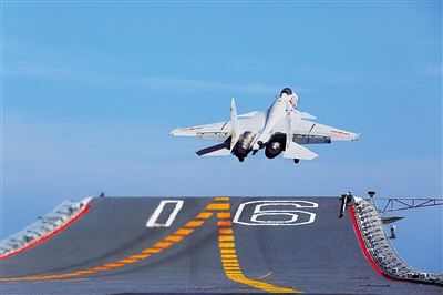 7月1日,一架歼-15舰载战斗机从辽宁舰滑跃起飞。 自6月25日从青岛起航以来,由辽宁舰,导弹驱逐舰济南舰、银川舰,导弹护卫舰烟台舰组成的航母编队,昼夜航行转移多个海区,连续组织舰载机多种条件下舰基课目训练、开展多种作战背景的编队协同及指挥训练。航母编队跨区机动训练任务按计划顺利推进。 新华社记者 曾涛 摄