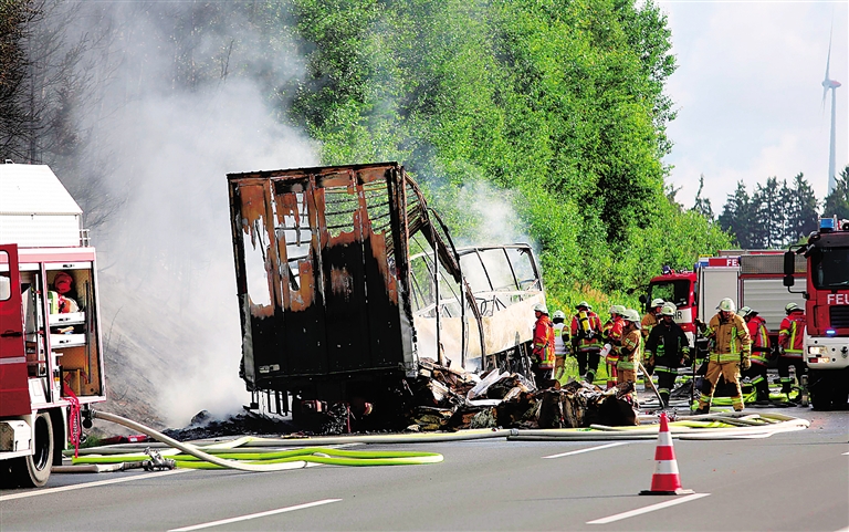 法新社援引德国警方的话报道,3日上午7时左右,巴伐利亚州施坦巴赫附近的A9高速公路发生交通拥堵,一辆旅游巴士与一辆货车相撞后起火。