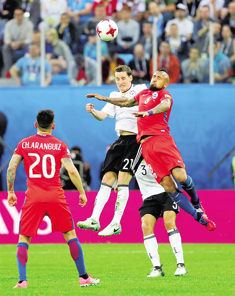 7月2日,在俄罗斯圣彼得堡举行的2017年联合会杯足球赛决赛中,德国队以1∶0战胜智利队,夺得冠军。图为德国队球员鲁迪(上左)与智利队球员比达尔(上右)在比赛中争顶。新华社发