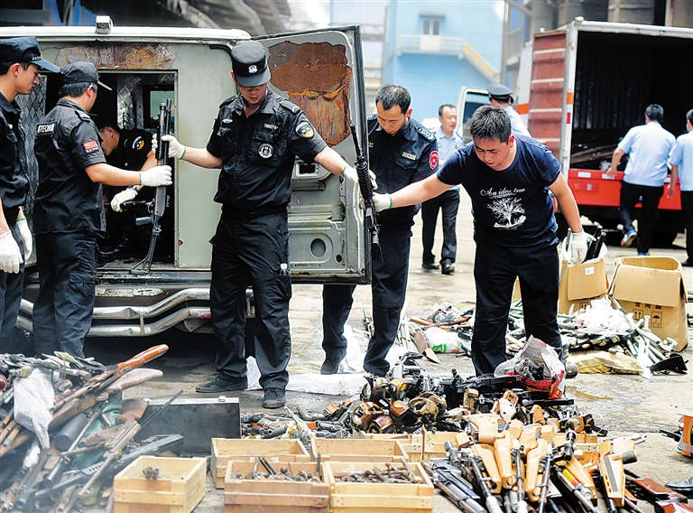 7月5日,警方工作人员在福建省福州市罗源县闽光钢铁厂清点集中销毁的枪爆物品。 当日,在公安部的统一组织下,全国202个市、县同步开展统一销毁非法枪爆物品活动,对近年来全国公安机关查缴和群众主动上缴的私制火药枪、气枪、猎枪等非法枪支及一大批炸药、雷管等爆炸物进行集中销毁。新华社记者 宋为伟 摄