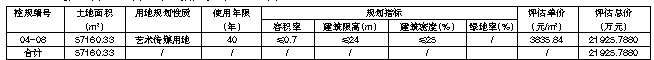 一、挂牌出让宗地基本情况和规划指标等要求:该挂牌出让宗地位于海棠湾A4片区控规04-08地块, 用地总面积57160.33平方米(海南平面坐标系57136.90平方米),用地四至及界址坐标详见地块勘测定界图。根据三亚市现代服务业产业园管理委员会出具的三服园管函〔2017〕140号文件,该宗地概况及规划指标等情况详见下表: