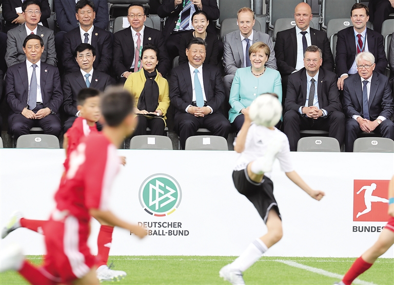 习近平和彭丽媛同默克尔共同观看中德青少年足球友谊赛。习近平指出,中德两国足球合作正在不断深入推进。提高足球水平是一项系统工程,中方愿同德方加强足球领域全方位交流合作。相信在双方共同努力下,中德足球合作一定会结出更多硕果。