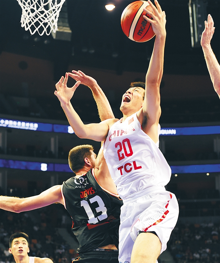 7月9日,在2017年中澳国际男篮对抗赛东莞站的比赛中,中国男篮蓝队以75∶89不敌澳大利亚联队。图为中国男篮蓝队球员任骏飞(右)在比赛中上篮。 新华社发