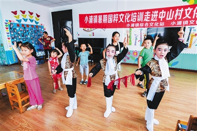 7月9日,浙江省长兴县小浦镇为外地来过暑假的“小候鸟”们举办了一场京剧培训活动。小浦镇中心幼儿园“小京班”京剧社的孩子们和当地京剧票友周富根现场表演并教“小候鸟”们演唱京剧选段,感受国粹魅力。这些来自安徽、江西等地的“小候鸟”们,暑假期间从家乡来到小浦镇与父母团聚,当地政府、教育部门组织了丰富多彩的活动帮“小候鸟”们融入当地生活。图为小浦镇中心幼儿园“小京班”京剧社的孩子们在带领“小候鸟”们一起演京剧。新华社记者 徐昱 摄