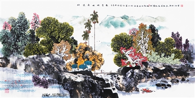 顾名思义,这一组作品描绘的都是海南岛西部的秀丽景色。画中,阮江华的表现手法是多样的,面对丰厚的植被,他用积染法层层渲染,不回避葱翠碧绿,不避让植物的雷同。在许多画家看来,海南岛四季如春,一年四季都是生机盎然,但是如果真的能够分出四季,却是需要很扎实、很真切的感受的。