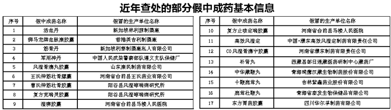 近年来,海南省食品药品监督管理局会同公安部门查处了一批生产、销售假中成药的违法案件,端掉了若干个生产假中成药的黑窝点,这些假药(品名附后)主要宣称能够治疗风湿病、颈椎病、关节炎、腰椎间盘突出、骨质增生、支气管哮喘、支气管炎以及补肾壮阳、提高免疫力等功能。经检验,这些假中成药普遍含有镇痛类、激素类等化学药品成分,未含有所标示的名贵中药材,服用这些假药虽可暂时缓解症状,但达不到治疗的目的,会延误病情,长期服用还将导致其他危害。