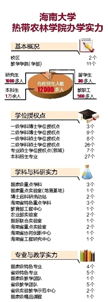 此外,海南大学热带农业学科还培育了3个一级学科博士点、9个二级学科博士点、8个一级学科硕士点、26个二级学科硕士点、7个硕士专业学位招生领域、2个博士后科研流动站和1个国家重点实验室(培育基地),7个省部级科研平台。