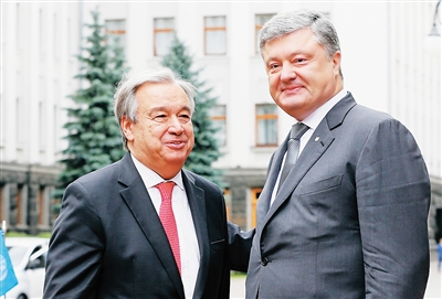 7月9日,在乌克兰首都基辅,乌克兰总统波罗申科(右)迎接到访的联合国秘书长古特雷斯。 联合国秘书长古特雷斯9日在乌克兰首都基辅说,联合国支持一切有助于解决乌克兰东部冲突问题的机制,如“诺曼底模式”四方会谈(法国、德国、俄罗斯、乌克兰)、乌克兰问题三方联络小组(乌克兰、欧安组织、俄罗斯)等。 新华社/路透