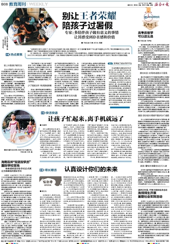 近一段时间以来,一款名叫“王者荣耀”的手机游戏,引发了舆论的广泛热议和激烈争论。按照官方提供的数据,这款游戏的注册用户已超过2亿,其中,有3600万中小学生在玩,被称作“国民游戏”。目前,海南绝大多数学校已经放假,怎样让孩子过好暑假不再沉溺于游戏中,也成为了摆在家长们面前的难题。