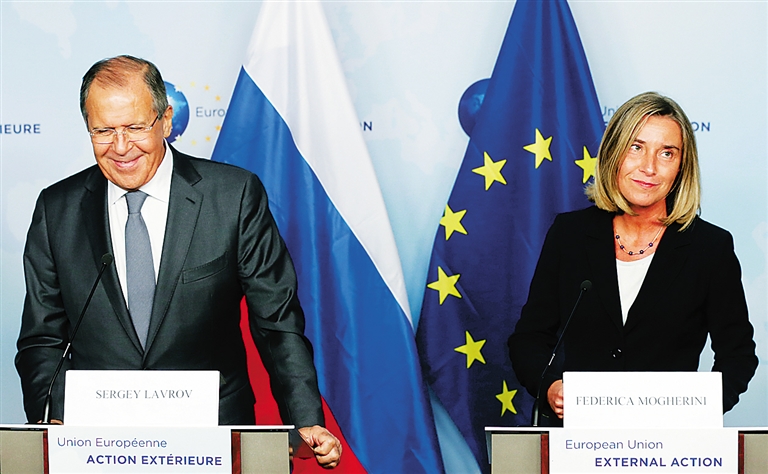 7月11日,在比利时布鲁塞尔,俄罗斯外交部长拉夫罗夫(左)与欧盟外交与安全政策高级代表莫盖里尼出席联合新闻发布会。 拉夫罗夫当天在与欧盟外交与安全政策高级代表莫盖里尼会见后向媒体表示,如果美国不慎重考虑俄方要求,归还俄在美的两处外交机构房产,俄将采取报复措施。 新华社/路透