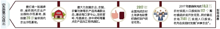 2017年全面完成农村土地承包经营权确权到户颁证任务,建立土地流转规范管理制度,稳步推进农村土地集体所有权、农户承包权、土地经营权“三权分置”改革和经营权流转,引导金融和社会资本投向农业,积极发展适度规模经营。加快推进文昌征地制度改革试点和农村集体经营性 建设用地入市试点工作。大力推进文昌、琼中“房地一体”的农村宅基地和集体建设用地确权登记颁证工作。