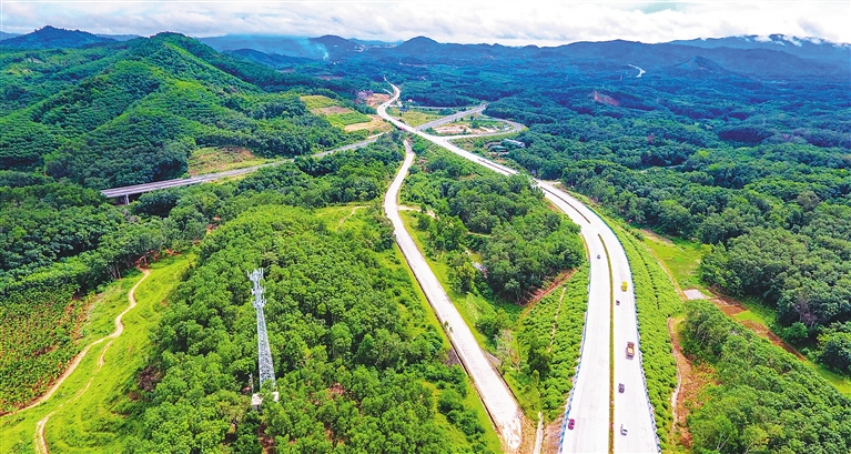 7月12日,在琼中黎族苗族自治县境内中线高速公路琼中互通进县城入口处,旧的公路(左)已经停止使用,新的公路(右)建成并已经使用,路面的护栏和绿化等基础设施也不断完善,大大方便城区居民高效利用中线高速出行。 本报记者 陈元才 通讯员 朱德权 秦海灵 摄