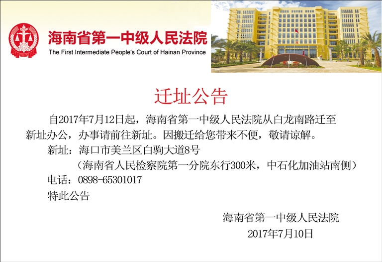 海南省第一中级人民法院迁址公告