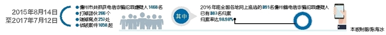 儋州市公安局汇总数据表明:2015年8月14日至2017年7月12日,儋州市共抓获电信诈骗犯罪嫌疑人1468名,打掉团伙266个,端掉窝点257处,侦破案件1058起。其中,2016年底全国各地网上追逃的391名儋州籍电信诈骗犯罪嫌疑人,已有387名归案,归案率达98.98%。同时,警方缴获、冻结赃款1756万余元,收缴“客服”手机1908部、手机卡2049张、银行卡2042张、电脑393台、小汽车98辆,关停涉案电话号码4004个,报停涉案银行账号1469个,建立企业“400白名单”2597个。