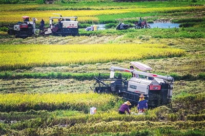 在儋州,水稻已经进入收获季,越来越多的农民不再为收割水稻而烦恼。按今年收割水稻的市场价格,每亩只要花80元,就有收割机专业队到田间帮忙收割,既省事省工,又大大提高了稻谷的回收率。图为儋州市东成镇崖碧洋田间机械收割水稻的场面。
