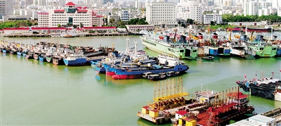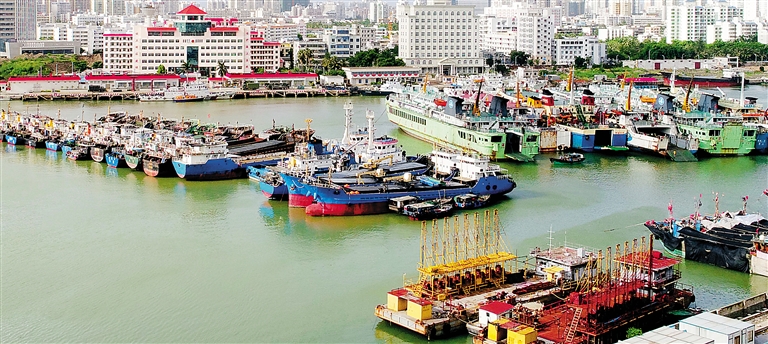 7月15日,在海口市新港码头,归港避风的船只成排停靠。当天下午,南海热带低压加强为今年第4号台风“塔拉斯”,我省及时组织各地船只回港避风。本报记者 张茂 摄