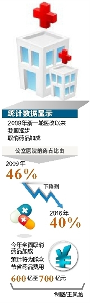 “十二五”以来,我国公立医院综合改革提速扩面,“以药补医”的机制加快破除。截至2017年初,县级公立医院全部取消药品加成,城市公立医院改革试点范围已扩大到200个地市。在前期试点基础上,今年公立医院综合医改将向全国推开。其中,取消药品加成,改变“以药养医”不合理现状,是改革的重中之重。