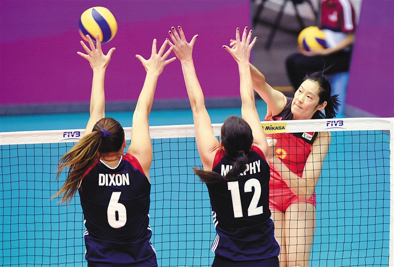 16日,世界女排大奖赛澳门站落幕。中国队以3:2战胜美国队,以两胜一负的成绩获得亚军。图为朱婷(右)在比赛中扣球。 新华社发