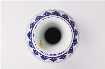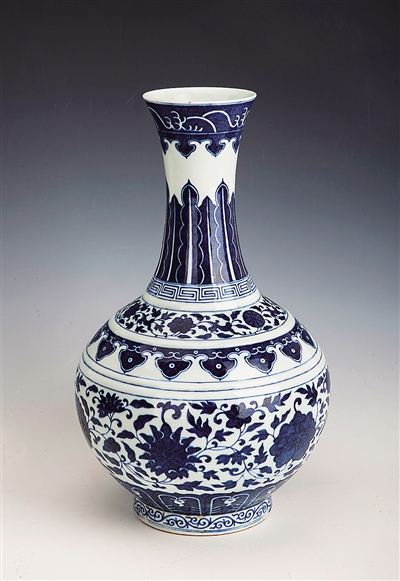 赏瓶的器形在各代发展中均有一定规制,造型和纹饰大体相同,只在颈、腹的细部和青花发色等方面略有差异。雍正朝赏瓶出现后,纹饰画法就形成了统一的“官样”。乾隆赏瓶的腹部相对较圆,上腹部的凸弦纹并不突出;颈下部的蕉叶纹画法自然,缠枝花卉繁而不乱,极为精美;青花发色也略微发紫,有很多仿永宣时期的铁锈斑状和黑点,但和明初所用的苏麻离青(国外进口的一种青花料)发色差距较大,具有清代青花料的特征。到嘉庆时期基本上承袭乾隆的形制和画法,只是构图略显繁缛。