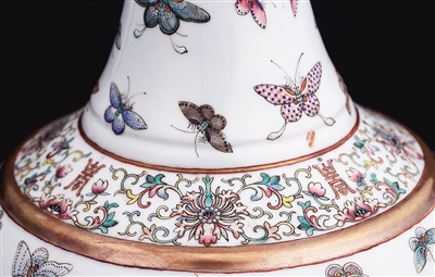 古人讲究“图必有意,意必吉祥”,因“碟”与“耋”同音,《礼记·曲礼上》曰:“八十九十曰耄。”古人称年事已高的老人为“耄耋”,故以百蝶寓意寿至耄耋。赏瓶呈现出来的洁白地釉与粉彩蝴蝶,相互映衬,给人以从容淡定、含蓄闲适的艺术之美。细观肩、腹部的交界处的缠枝花卉中还有金彩寿字纹点缀其间,这与蝴蝶纹的设置有异曲同工之妙。从彩蝶的寓意和寿字的装饰可以推测出赏瓶功用的丰富化,已不再局限于仅赏赐有功的臣下,以慈禧太后寿辰赏赐群臣的粉彩赏瓶来说,可能还带有为统治者祝寿或者奖励耆年硕德的老臣的用意。