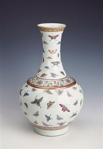 海口市博物馆藏的清光绪粉彩百蝶图赏瓶,口径9.7厘米,足径12.5厘米,高38厘米;圆唇,撇口,长颈,圆腹,圈足。胎质洁白细密,釉色均匀透亮;口沿处描金,并用粉彩绘如意云头纹,肩腹交接处用金彩描绘两条弦纹隔出一条装饰带,内绘粉彩缠枝花卉;近底处绘一圈粉彩几何图案;颈部、腹部的主题纹饰为色彩形态各异、翩翩起舞的蝴蝶,俗称“百蝶图”;此瓶底部以矾红彩书“大清光绪年制”六字双行楷书款,为晚清官窑标准器。