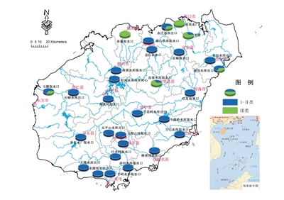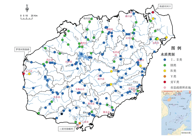 全省地表水环境质量总体为优,水质总体优良率为93.0%。开展监测的52条河流110个断面中,94.5%的监测断面水质符合或优于地表水Ⅲ类标准。其中,Ⅰ类水质断面占0.9%,Ⅱ类占68.2%,Ⅲ类占25.5%,Ⅳ类占2.7%,Ⅴ类占0.9%,劣Ⅴ类占1.8%。Ⅳ类水质分布在文教河、文昌河、塔洋河的局部河段,Ⅴ类水质分布在三亚河的城市河段,劣Ⅴ类水质分布在罗带河、珠溪河的入海河口。