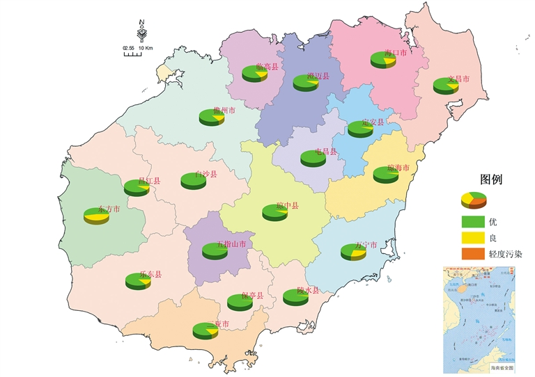 全省空气质量总体优良,优良天数比例为99.8%,其中优占89.1%、良占10.7%,轻度污染占0.2%,无中度及重度污染天数。三亚、儋州、五指山、琼海、文昌、东方、定安、屯昌、澄迈、临高、白沙、昌江、乐东、保亭、陵水、琼中16个市县空气质量优良天数比例为100%;海口、万宁2个市县(三沙市除外)受臭氧影响,分别出现2天、1天轻度污染,优良天数比例分别为97.8%、98.9%。与去年同期比较,全省空气质量优良天数比例上升0.2%,轻度污染天数比例下降0.2%。