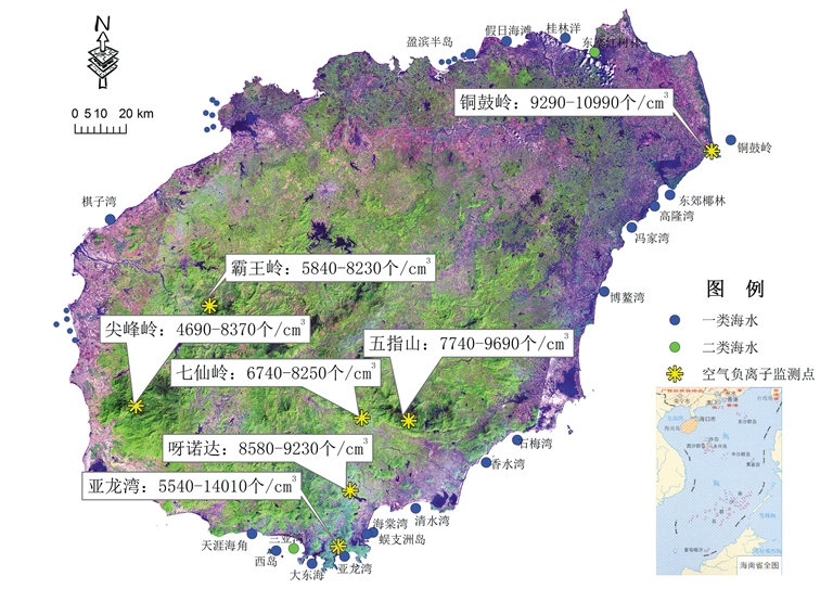 全省主要森林旅游区空气质量优良,霸王岭、尖峰岭、五指山、七仙岭、铜鼓岭、亚龙湾、呀诺达7个主要森林旅游区空气负离子平均浓度分别为7085个/cm3、6385个/cm3、8515个/cm3、7505个/cm3、10055个/cm3、9720个/cm3、8870个/cm3,远超过世界卫生组织规定清新空气1000个~1500个/cm3标准,对人体健康极有利。与去年同期比较,铜鼓岭、亚龙湾和呀诺达的空气负离子浓度明显升高,其余森林旅游区空气负离子浓度无明显变化。