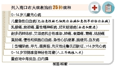 《方案》确定了大病专项救治定点医院。其中,秀英区定点收治医院为省人民医院大病专项救治定点收治医院;龙华区定点收治医院为海南医学院第一附属医院、海南医学院第二附属医院;美兰区定点收治医院为海口市人民医院;琼山区定点收治医院为海口市第三人民医院、海口市第四人民医院。对于重症地中海贫血、儿童白血病和儿童先天性心脏病患者可不受划区限制,到省卫计委指定的医院实施专项救治。