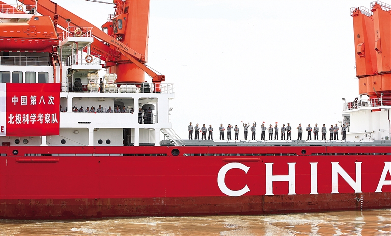 7月20日,“雪龙”号极地科学考察船驶离码头。 当日,中国第八次北极科学考察队96名队员乘“雪龙”号从上海的中国极地考察国内基地码头启航,执行北极科学考察任务。此次考察以“雪龙”号极地科学考察船为平台,将开展北极航道综合调查、海洋生物多样性、海洋水文、海洋化学、海洋地质、海洋微塑料和海洋垃圾等污染物调查等考察工作。在白令海、楚科奇海、北欧海、西北航道和北极高纬度海区等重点海域,开展业务化调查。 新华社记者 方喆 摄