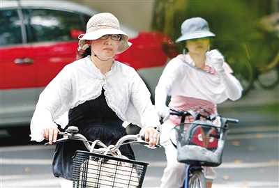 7月21日,两名女士穿戴防晒装备骑行在上海衡山路上。 新华社记者 凡军 摄