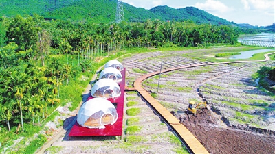 7月21日,三亚中廖村的星空帐篷和花海正在建设中,预计今年10月1日建好迎客。目前,中廖村正在进行“升级版”美丽乡村建设,村中田园栈道、中廖花海、星空帐篷、装配式酒店等特色项目正加快推进。本报记者 张茂 摄