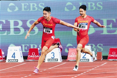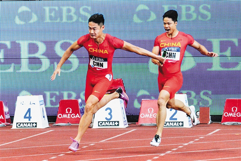 7月21日,图为中国队苏炳添(右)和张培萌在比赛中交接棒。 新华社发