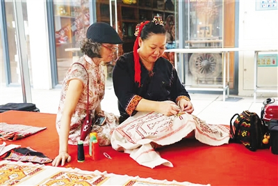 身着黎族传统服装,带着传统头饰与耳饰,一会儿坐在地上现场织锦,一会儿向观众展示黎锦双面绣作品,“双面绣是正面跟反面一样的,这不是画上去的图案,而是直接在上面绣出来的。”黎族双面绣技艺传承人符秀英与她的双面绣绝活,揭开了纺织“活化石”黎锦的神秘面纱,吸引了不少关注。