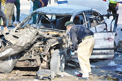7月24日,在巴基斯坦拉合尔,一名警察在一起自杀式炸弹袭击现场检查被毁车辆。 据巴基斯坦媒体24日报道,该国东部城市拉合尔当天下午发生一起自杀式炸弹袭击,造成至少15人死亡,22人受伤。 新华社发